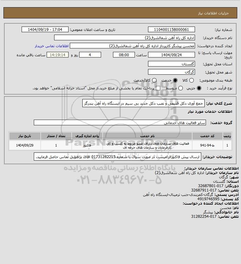 شرح کلی نیاز: جمع آوری دکل قدیمی و نصب دکل جدید بی سیم در ایستگاه راه آهن بندرگز