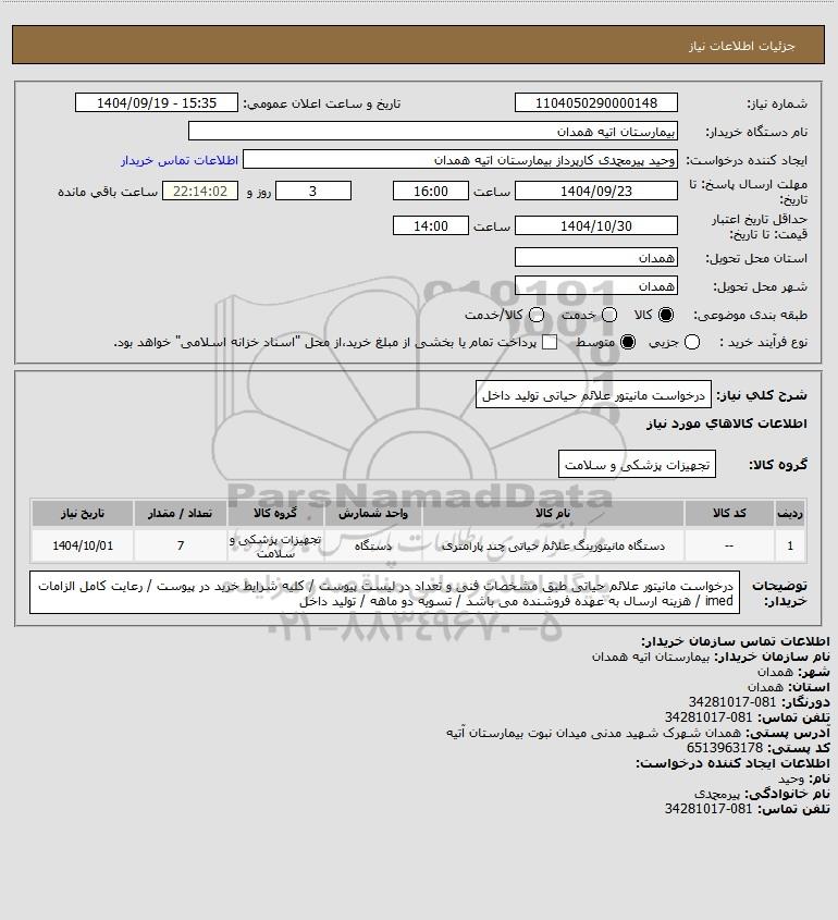 شرح کلی نیاز: درخواست مانیتور علائم حیاتی تولید داخل
