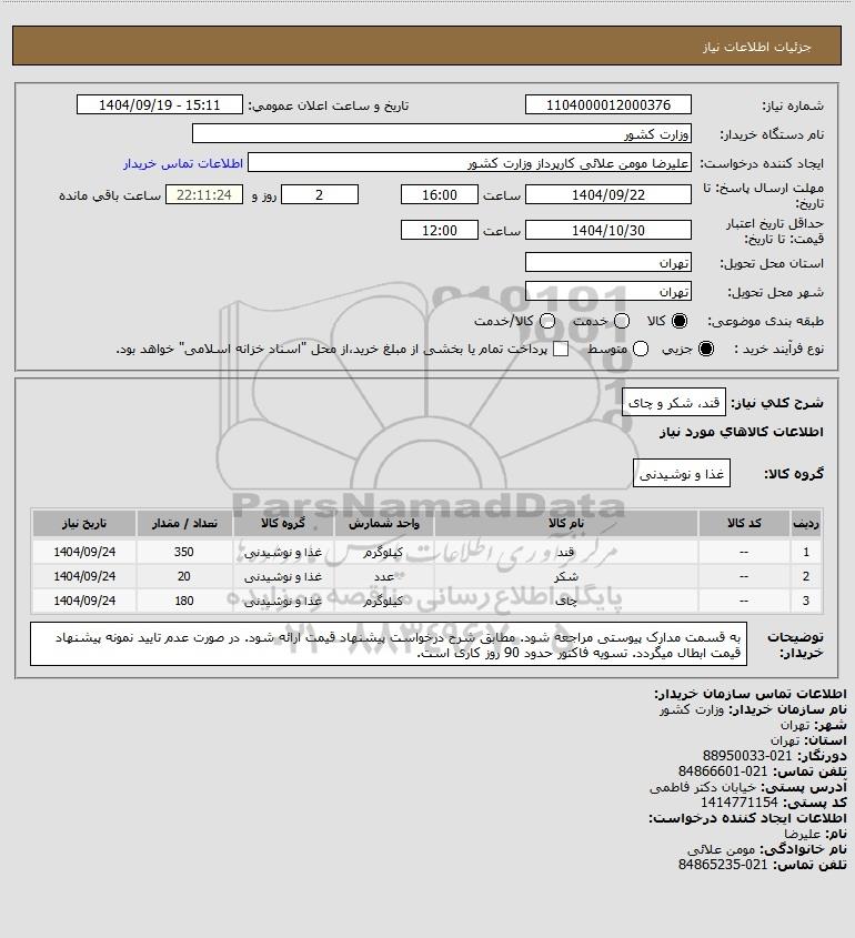 | 1 | -- | قند | کیلوگرم | غذا و نوشیدنی | 350 | 1404/09/24 |