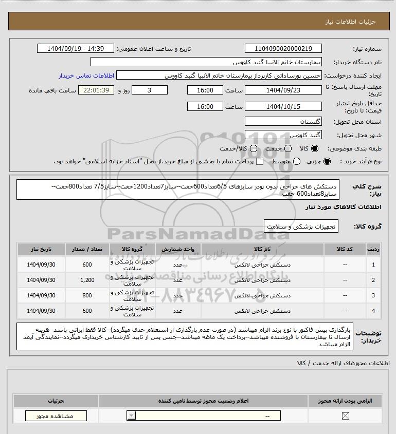 شرح کلی نیاز: دستکش های جراحی بدون پودر سایزهای 6/5تعداد600جفت--سایز7تعداد1200جفت--سایز7/5 تعداد800جفت--سایز8تعداد600 جفت