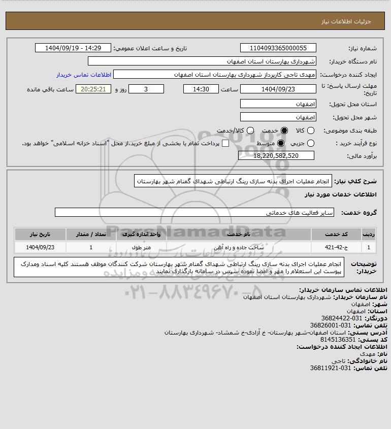 شرح کلی نیاز: انجام عملیات اجرای بدنه سازی رینگ ارتباطی شهدای گمنام شهر بهارستان