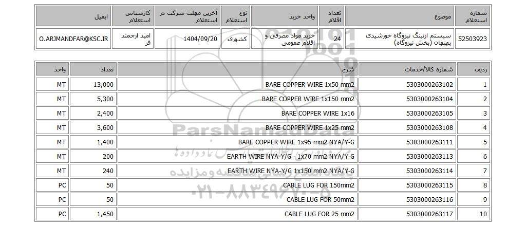 | 52503923 | سیستم ارتینگ نیروگاه خورشیدی بهبهان (بخش نیروگاه) | 24 | خرید مواد مصرفی و اقلام عمومی | کشوری | 1404/09/20 | امید ارجمند فر | O.ARJMANDFAR@KSC.IR |
