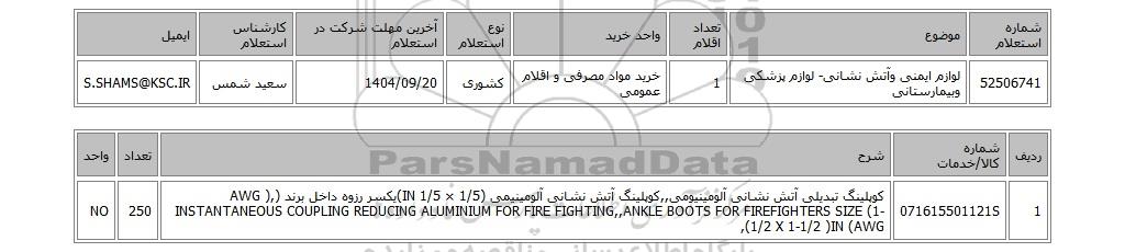 | 52506741 | لوازم ایمنی وآتش نشانی- لوازم پزشکی وبیمارستانی | 1 | خرید مواد مصرفی و اقلام عمومی | کشوری | 1404/09/20 | سعید شمس | S.SHAMS@KSC.IR |