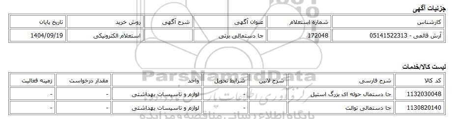 | آرش قائمی - 05141522313 | 172048 | جا دستمالی برتی | استعلام الکترونیکی | 1404/09/19 |