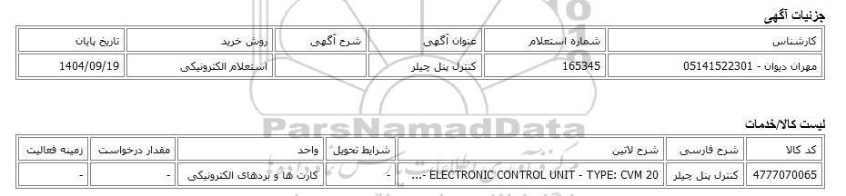 | مهران دیوان - 05141522301 | 165345 | کنترل پنل چیلر | استعلام الکترونیکی | 1404/09/19 |