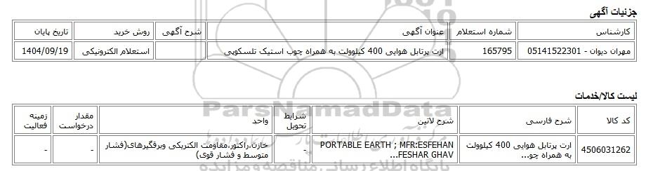 | مهران دیوان - 05141522301 | 165795 | ارت پرتابل هوایی 400 کیلوولت به همراه چوب استیک تلسکوپی | استعلام الکترونیکی | 1404/09/19 |