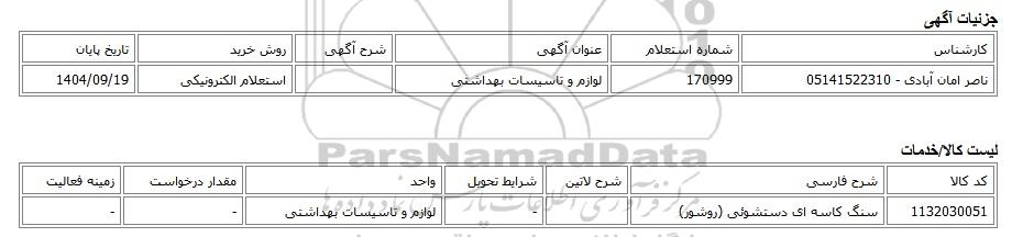 | ناصر امان آبادی - 05141522310 | 170999 | لوازم و تاسیسات بهداشتی | استعلام الکترونیکی | 1404/09/19 |