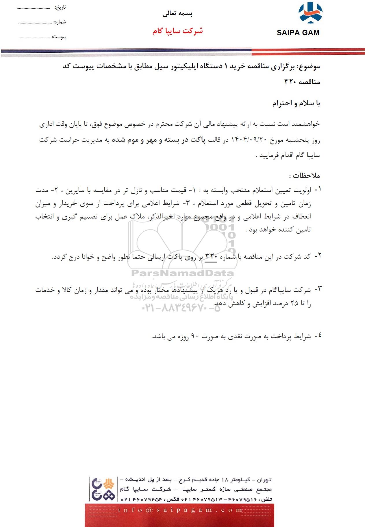 خواهشمند است نسبت به ارائه پیشنهاد مالی آن شرکت محترم در خصوص موضوع فوق، تا پایان وقت اداری روز پنجشنبه مورخ 1404.09.20 در قالب پاکت در بسته و مهر و موم شده به مدیریت حراست شرکت سایپا گام اقدام فرمایید.