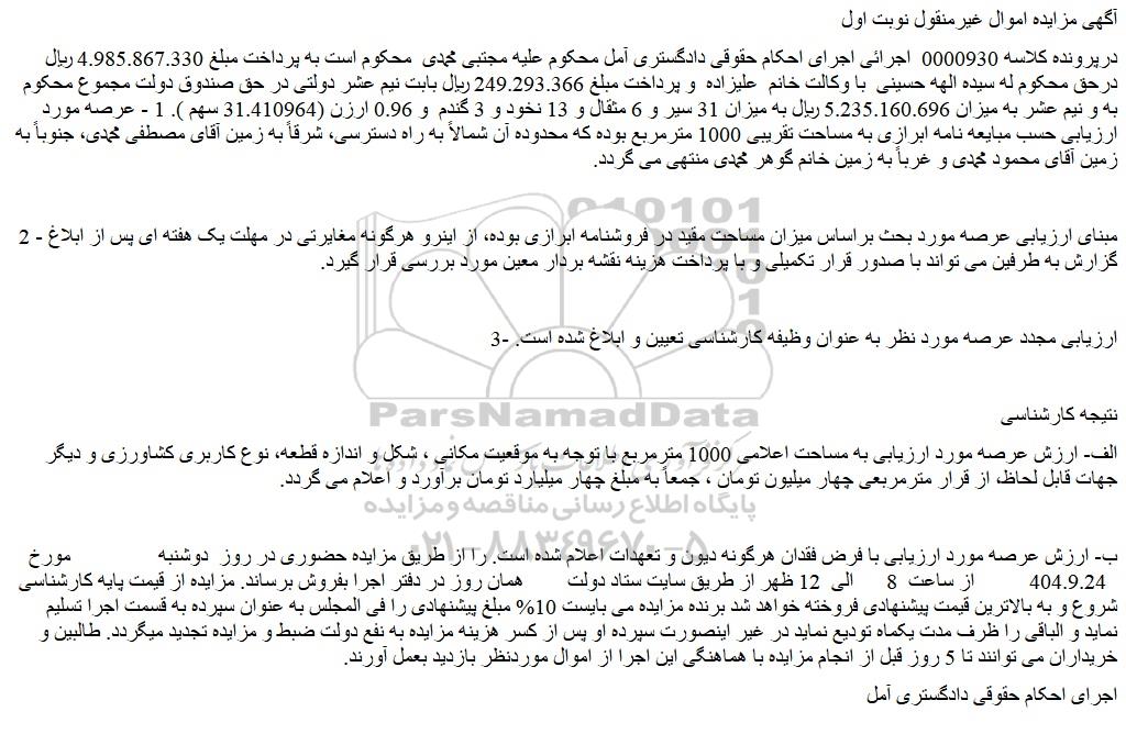 درپرونده کلاسه 0000930 اجرائی اجرای احکام حقوقی دادگستری آمل محکوم علیه مجتبی محمدی محکوم است به پرداخت مبلغ 4.985.867.330 ریال درحق محکوم له سیده الهه حسینی با وکالت خانم علیزاده و پرداخت مبلغ 249.293.366 ریال بابت نیم عشر دولتی در حق صندوق دولت مجموع محکوم به و نیم عشر به میزان 5.235.160.696 ریال به میزان 31 سیر و 6 مثقال و 13 نخود و 3 گندم و 0.96 ارزن (31.410964 سهم ). 1 - عرصه مورد ارزیابی حسب مبایعه نامه ابرازی به مساحت تقریبی 1000 مترمربع بوده که محدوده آن شمالاً به راه دسترسی، شرقاً به زمین آقای مصطفی محمدی، جنوباً به زمین آقای محمود محمدی و غرباً به زمین خانم گوهر محمدی منتهی می گردد.