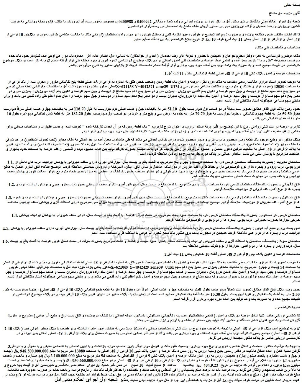 3.با توجه به موقعیت مکانی، مساحت و شکل هندسی، کاربری و نوع بهره برداری، وضعیت طلق ملک و عوامل موثر دیگر بدون احتساب موارد بازداشت و یا دیون احتمالی به اشخاص حقیقی و یا حقوقی و با درنظر گرفتن تخلیه کامل و آماده انتقال مالکیت در دفاتر رسمی بدین وسیله ارزش به روز شش دانگ عرصه و اعیان پلاک ثبتی 10 فرعی از 48. اصلی به مساحت 13080 متر مربع به مبلغ 948.500.000.000 ریال (نهصد و چهل و هشت میلیارد و پانصد میلیون ریال) و همچنین ارزش به روز شش دانگ عرصه و اعیان پلاک ثبتی 9 فرعی از 48.اصلی به مساحت 54 متر مربع به مبلغ 2.160.000.000 ریال (دو میلیارد و یکصد و شصت میلیون ریال) براورد و اعلام می گردد. مجموع ارزش شش دانگ عرصه و اعیان دو پلاک 9 فرعی و 10 فرعی هر دو از 48- اصلی برابر مبلغ 950.660.000.000 ریال (نهصد و پنجاه میلیارد و ششصد و شصت میلیون ریال) براورد و اعلام می گردد. که مزایده در تاریخ 404.9.23 روز یکشنبه ساعت 9 صبح لغایت 10 صبح در محل دفتر شعبه اول اجرای احکام مدنی دادگستری شهرستان آمل از قیمت پایه شروع و به بالا ترین قیمت پیشنهادی واگذار می گردد برنده مزایده باید ده درصد مبلغ پیشنهادی را فی المجلس پرداخت نماید و باقیمانده را حداکثر ظرف یک ماه از تاریخ مزایده پرداخت نماید در صورت عدم پرداخت باقیمانده مبلغ ظرف مهلت مقرر فوق ، مبلغ پرداخت شده اولیه پس از کسر هزینه مزایده در راستای ماده 129 قانون اجرای احکام مدنی در حق دولت ضبط خواهد شد چنانچه جهت انتقال مال مورد مزایده هزینه ای لازم باشد بر عهده خریدار است طالبین می توانند ظرف مهلت پنج روز قبل از مزایده با هماهنگی این اجرا از مال مورد مزایده دیدن نمایند .مدیر شعبه اول اجرای احکام مدنی آمل
