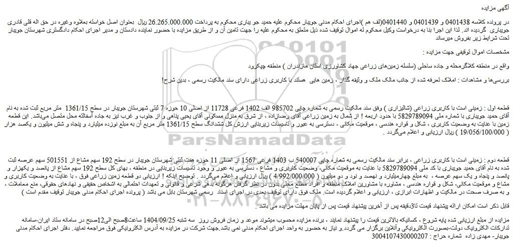 در پرونده کلاسه 0401438 و 0401439 و 0401440(لف هم )اجرای احکام مدنی جویبار محکوم علیه حمید جو یباری محکوم به پرداخت 26.265.000.000 ریال بعنوان اصل خواسته بعلاوه وغیره در حق اله قلی قادری جویباری گردیده اند. لذا این اجرا بنا به درخواست وکیل محکوم له اموال توقیف شده ذیل متعلق به محکوم علیه را جهت تامین آن و از طریق مزایده با حضور نماینده دادستان و مدیر اجرای احکام دادگستری شهرستان جویبار تحت شرایط زیر بفروش میرساند
