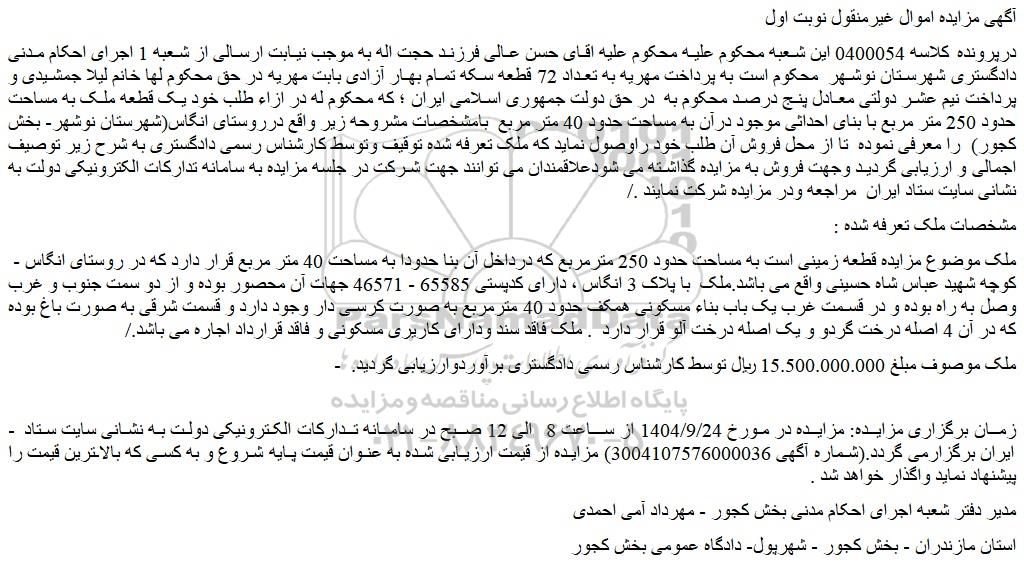 درپرونده کلاسه 0400054 این شعبه محکوم علیـه محکوم علیه اقای حسن عالی فرزند حجت اله به موجب نیابت ارسالی از شعبه 1 اجرای احکام مدنی دادگستری شهرستان نوشهر محکوم است به پرداخت مهریه به تعداد 72 قطعه سکه تمام بهار آزادی بابت مهریه در حق محکوم لها خانم لیلا جمشیدی و پرداخت نیم عشر دولتی معادل پنج درصد محکوم به در حق دولت جمهوری اسلامی ایران ؛ که محکوم له در ازاء طلب خود یک قطعه ملک به مساحت حدود 250 متر مربع با بنای احداثی موجود درآن به مساحت حدود 40 متر مربع بامشخصات مشروحه زیر واقع درروستای انگاس(شهرستان نوشهر- بخش کجور) را معرفی نموده تا از محل فروش آن طلب خود راوصول نماید که ملک تعرفه شده توقیف وتوسط کارشناس رسمی دادگستری به شرح زیر توصیف اجمالی و ارزیابی گردید وجهت فروش به مزایده گذاشته می شودعلاقمندان می توانند جهت شرکت در جلسه مزایده به سامانه تدارکات الکترونیکی دولت به نشانی سایت ستاد ایران مراجعه ودر مزایده شرکت نمایند ./