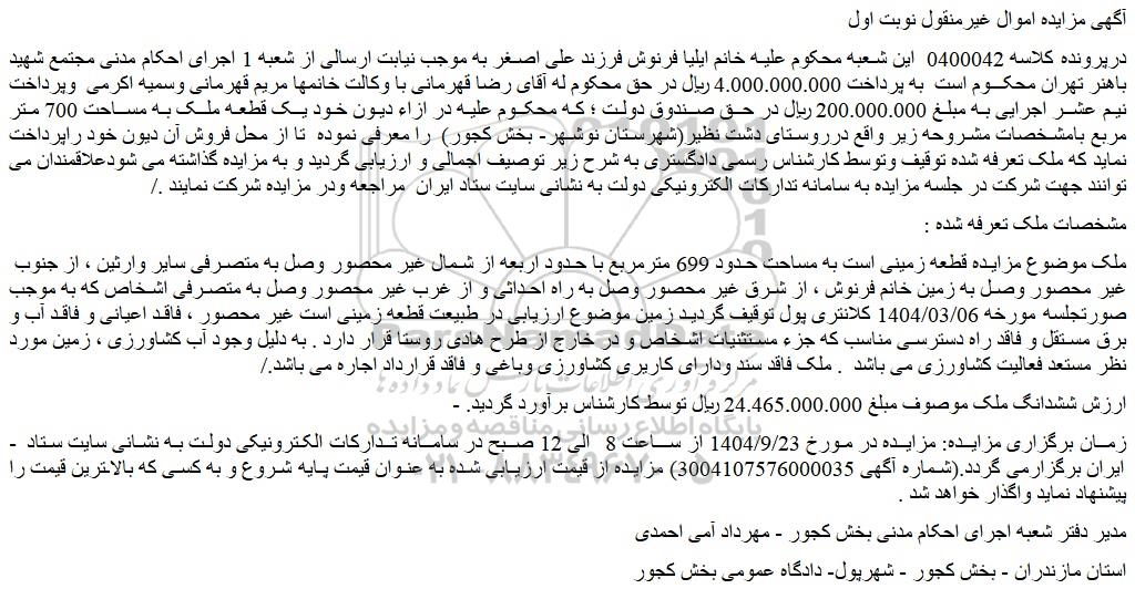 درپرونده کلاسه 0400042 این شعبه محکوم علیـه خانم ایلیا فرنوش فرزند علی اصغر به موجب نیابت ارسالی از شعبه 1 اجرای احکام مدنی مجتمع شهید باهنر تهران محکـــوم است به پرداخت 4.000.000.000 ریال در حق محکوم له آقای رضا قهرمانی با وکالت خانمها مریم قهرمانی وسمیه اکرمی وپرداخت نیم عشر اجرایی به مبلغ 200.000.000 ریال در حق صندوق دولت ؛ که محکوم علیه در ازاء دیون خود یک قطعه ملک به مساحت 700 متر مربع بامشخصات مشروحه زیر واقع درروستای دشت نظیر(شهرستان نوشهر- بخش کجور) را معرفی نموده تا از محل فروش آن دیون خود راپرداخت نماید که ملک تعرفه شده توقیف وتوسط کارشناس رسمی دادگستری به شرح زیر توصیف اجمالی و ارزیابی گردید و به مزایده گذاشته می شودعلاقمندان می توانند جهت شرکت در جلسه مزایده به سامانه تدارکات الکترونیکی دولت به نشانی سایت ستاد ایران مراجعه ودر مزایده شرکت نمایند ./