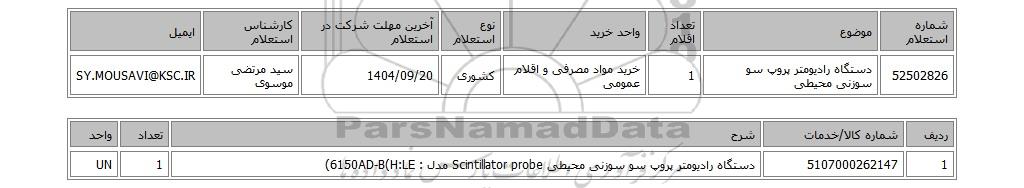 | 52502826 | دستگاه رادیومتر پروپ سو سوزنی محیطی | 1 | خرید مواد مصرفی و اقلام عمومی | کشوری | 1404/09/20 | سید مرتضی موسوی | SY.MOUSAVI@KSC.IR |