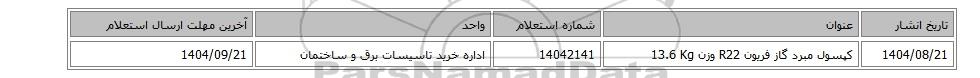 | 1404/08/21 | کپسول مبرد گاز فریون R22 وزن 13.6 Kg | 14042141 | اداره خرید تاسیسات برق و ساختمان | 1404/09/21 |