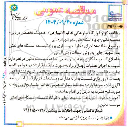 موضوع مناقصه: اجرای عملیات روسازی پروژه توسعه اسکله های نفتی بندر شهید رجایی به روش آسفالت و بتن الیافی