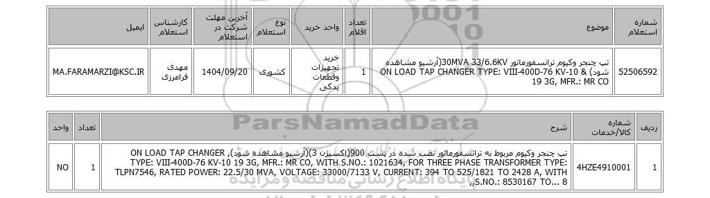 | 52506592 | تپ چنجر وکیوم ترانسفورماتور 30MVA 33/6.6KV(آرشیو مشاهده شود) & ON LOAD TAP CHANGER TYPE: VIII-400D-76 KV-10 19 3G, MFR.: MR CO | 1 | خرید تجهیزات وقطعات یدکی | کشوری | 1404/09/20 | مهدی فرامرزی | MA.FARAMARZI@KSC.IR |