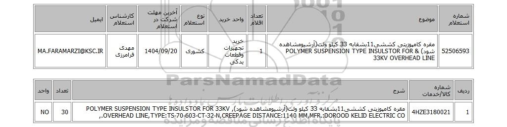 | 52506593 | مقره کامپوزیتی کششی11بشقابه 33 کیلو ولت(آرشیومشاهده شود) & POLYMER SUSPENSION TYPE INSULSTOR FOR 33KV OVERHEAD LINE | 1 | خرید تجهیزات وقطعات یدکی | کشوری | 1404/09/20 | مهدی فرامرزی | MA.FARAMARZI@KSC.IR |