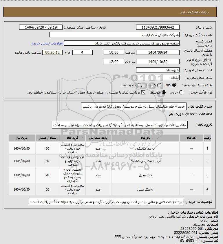 شرح کلی نیاز: خرید 4 قلم مکانیکال سیل به شرح پیوست/ تحویل کالا فوری می باشد.