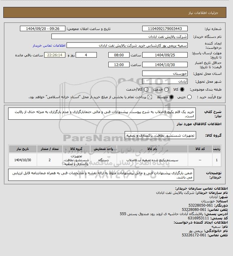 | 1 | -- | سیستم پکیج شده تصفیه آب فاضلاب | دستگاه | تجهیزات شستشو، نظافت، پاکسازی و تصفیه | 2 | 1404/10/30 |