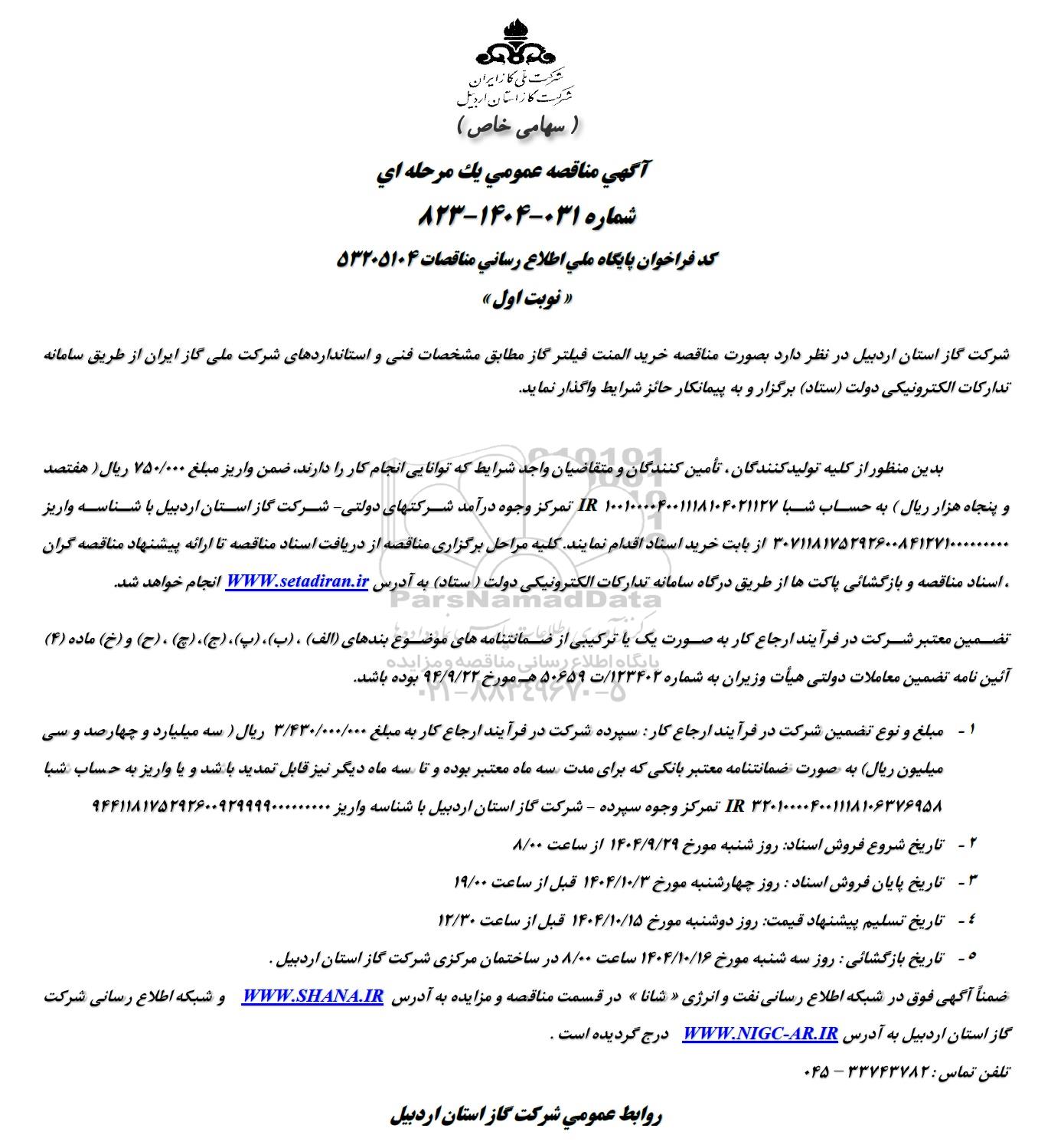 ضمناً آگهی فوق در شبکه اطلاع رسانی نفت و انرژی شانا» در قسمت مناقصه و مزایده به آدرس WWW.SHANA.IR و شبکه اطلاع رسانی شرکت گاز استان اردبیل به آدرس WWW.NIGC-AR.IR درج گردیده است .