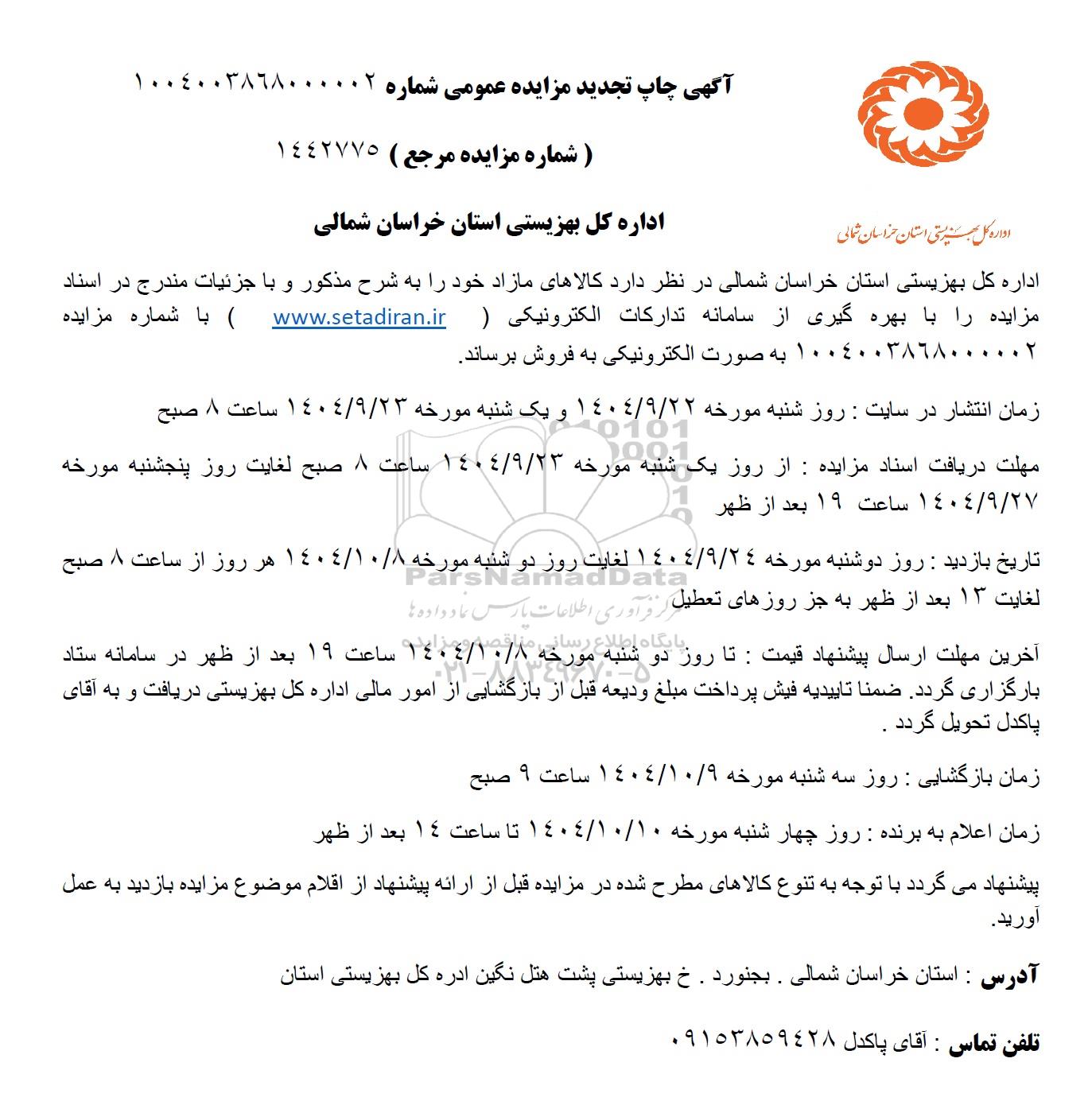 اداره کل بهزیستی استان خراسان شمالی در نظر دارد کالاهای مازاد خود را به شرح مذکور و با جزئیات مندرج در اسناد مزایده را با بهره گیری از سامانه تدارکات الکترونیکی (ستاد ایران) با شماره مزایده 1004003868000002 به صورت الکترونیکی به فروش برساند.
