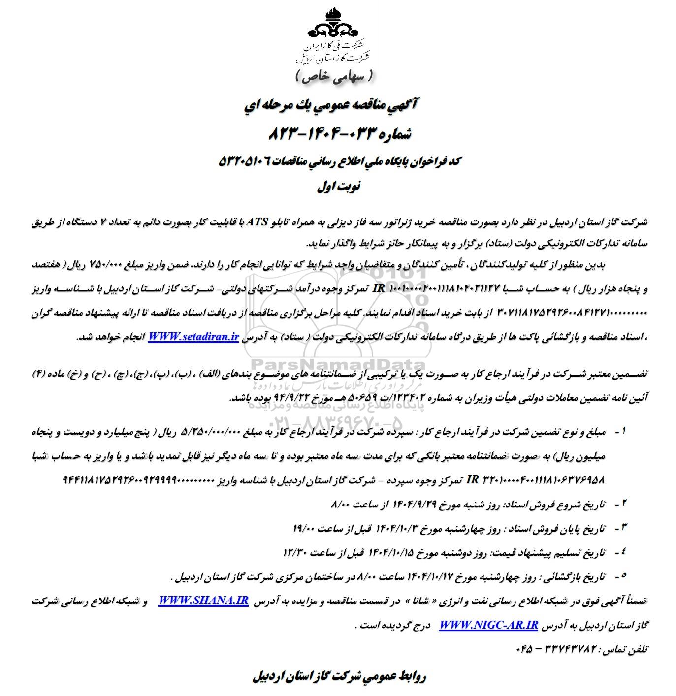 شرکت گاز استان اردبیل در نظر دارد بصورت مناقصه خرید ژنراتور سه فاز دیزلی به همراه تابلو ATS با قابلیت کار بصورت دائم به تعداد 7 دستگاه از طریق سامانه تدارکات الکترونیکی دولت (ستاد) برگزار و به پیمانکار حائز شرایط واگذار نماید.