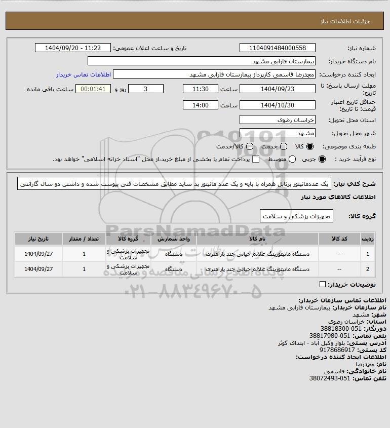 | 1 | -- | دستگاه مانیتورینگ علائم حیاتی چند پارامتری | دستگاه | تجهیزات پزشکی و سلامت | 1 | 1404/09/27 |