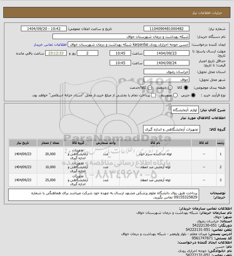 | 3 | -- | لوله آزمایش ضد انعقاد | عدد | تجهیزات آزمایشگاهی و اندازه گیری | 25,000 | 1404/09/23 |