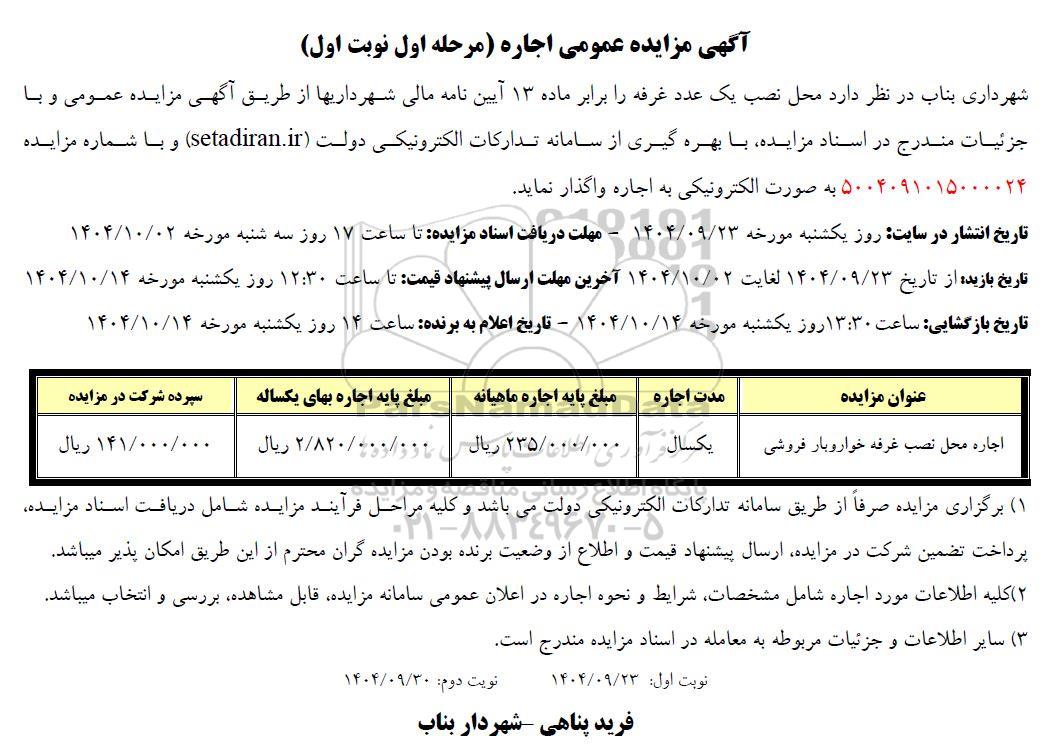 شهرداری بناب در نظر دارد محل نصب یک عدد غرفه را برابر ماده 13 آیین نامه مالی شهرداریها از طریق آگهی مزایده عمومی و با جزئیات مندرج در اسناد مزایده با بهره گیری از سامانه تدارکات الکترونیکی دولت (سایت ستاد ایران) و با شماره مزایده 5004091015000024 به صورت الکترونیکی به اجاره واگذار نماید.