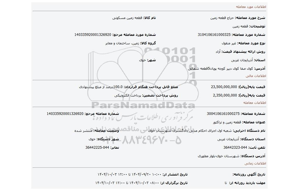 مزایده عمومی مزایده قطعه زمین برگزار میگردد. از کلیه افراد متخصص و شرکت‌های واجد شرایط دعوت به عمل می‌آید تا در این مزایده با کد خبرگزاری پارس نماد : 9981243 شرکت نمایند تاریخ شروع مزایده : 1404/09/20 مهلت شرکت در مزایده: تا پایان روز 1404/10/03 مکان برگزاری اموال واگذاری استان‌های مزایدات استان آذربایجان غربی و دسته‌بندی‌های مربوط به این حراجی املاک و زمین میباشد.