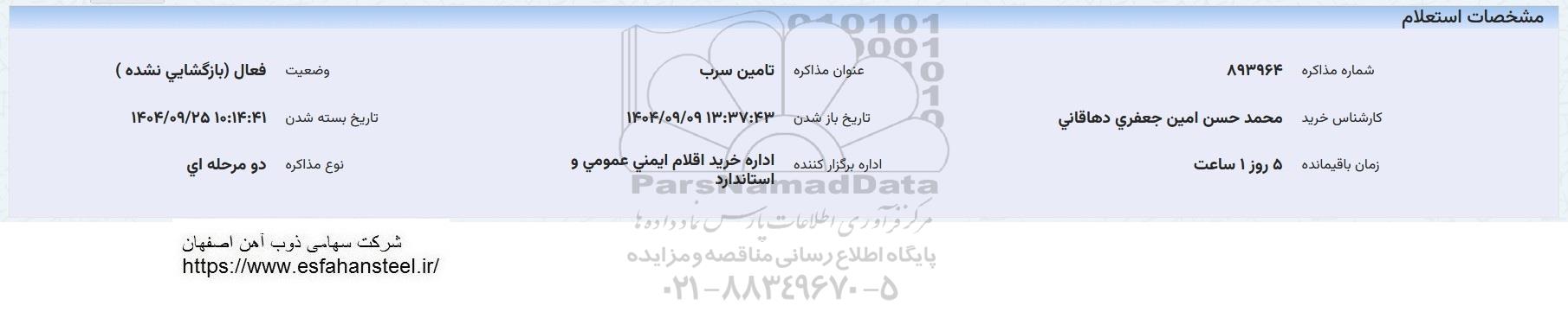 استعلام بها و موضوع استعلام استعلام تامین سرب به اطلاع کلیه شرکتها و افراد متخصص واجد شرایط میرساند، آگهی گذار در نظر دارد از طریق استعلام بها، نسبت به انتخاب و دریافت پیشنهادات اقدام نماید. این استعلام با کد آگهی ثبت شده در سامانه خبرگزاری پارس نماد : 9981257 منتشر شده است. مشخصات استعلام : تاریخ شروع استعلام: 1404/09/20 آخرین مهلت ارسال پیشنهاد قیمت : 1404/09/25 و محل اجرای پروژه : استان مناقصات استان اصفهان میباشد. استعلام قیمت مورد درخواست : استعلام تامین سرب با دستهبندیهای تخصصی و گروه های مرتبط : آهن آلات, ساخت،نصب و تعمیرات صنایع فولاد, مواد اولیه کارخانجات, استعلام اطلاع رسانی میگردد.