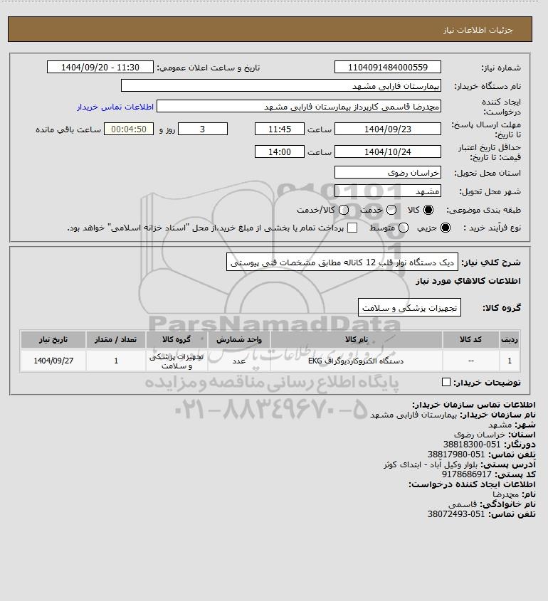 استعلام بها و موضوع استعلام استعلام دیک دستگاه نوار قلب 12 کاناله مطابق مشخصات فنی پیوستی به اطلاع کلیه شرکتها و افراد متخصص واجد شرایط میرساند، آگهی گذار در نظر دارد از طریق استعلام بها، نسبت به انتخاب و دریافت پیشنهادات اقدام نماید. این استعلام با کد آگهی ثبت شده در سامانه خبرگزاری پارس نماد : 9981292 منتشر شده است. مشخصات استعلام : تاریخ شروع استعلام: 1404/09/20 آخرین مهلت ارسال پیشنهاد قیمت : 1404/09/23 و محل اجرای پروژه : استان خراسان رضوی میباشد. استعلام قیمت مورد درخواست : استعلام دیک دستگاه نوار قلب 12 کاناله مطابق مشخصات فنی پیوستی با دستهبندیهای تخصصی و گروه های مرتبط : خدمات و تجهیزات آزمایشگاهی و پزشکی, استعلام اطلاع رسانی میگردد.