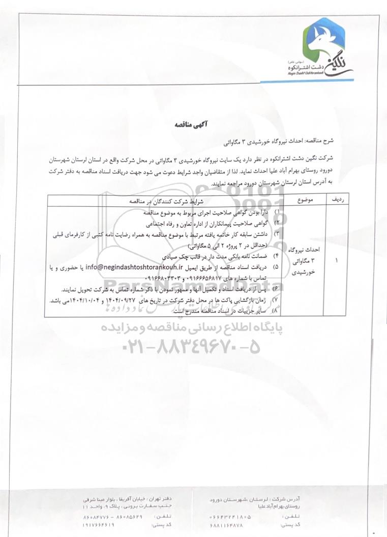 شرکت نگین دشت اشترانکوه در نظر دارد یک سایت نیروگاه خورشیدی 3 مگاواتی در محل شرکت واقع در استان لرستان شهرستان دورود روستای بهرام آباد علیا احداث نماید. لذا از متقاضیان واجد شرایط دعوت می شود جهت دریافت اسناد مناقصه به دفتر شرکت به آدرس استان لرستان شهرستان دورود مراجعه نمایند.