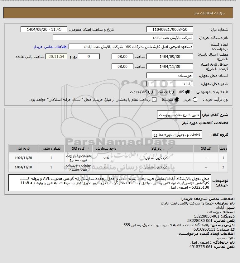 | 2 | -- | کپ کربن استیل | عدد | قطعات و تجهیزات تهویه مطبوع | 1 | 1404/11/30 |