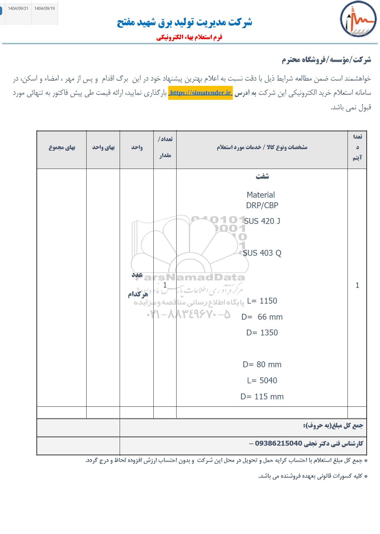 خواهشمند است ضمن مطالعه شرایط ذیل با دقت نسبت به اعلام بهترین پیشنهاد خود در این برگ اقدام و پس از مهر ، امضاء و اسکن در سامانه استعلام خرید الکترونیکی این شرکت به آدرس https://simatender.ir بارگذاری نمایید ارائه قیمت طی پیش فاکتور به تنهایی مورد قبول نمی باشد.