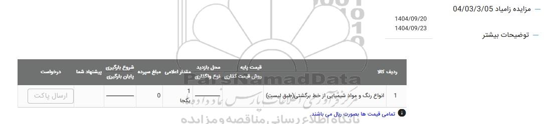 | 1 | انواع رنگ و مواد شیمیایی از خط برگشتی (طبق لیست) | 1 یکجا |