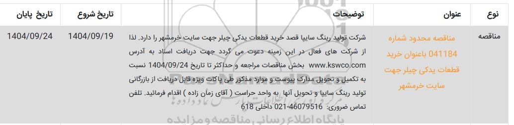 مناقصه  مناقصه محدود شماره 041184 با عنوان خرید قطعات یدکی چیلر جهت سایت خرمشهر شرکت تولید رینگ سایپا قصد خرید قطعات یدکی چیلر جهت سایت خرمشهر را دارد. لذا از شرکتهای فعال در این زمینه دعوت می گردد جههت دریافت اسناد به آدرس WWW.KSWCO.COM بخش مناقصات مراجعه و حداکثر تا تاریخ 1404.9.24 نسبت به تکمیل و تحویل مدارک پیوست و موارد مذکور طی پاکات ویژه قابل دریافت از بازرگانی تولید رینگ سایپا و تحویل آنها به واحد حراست (آقای زمان زاده) اقدام فرمایید