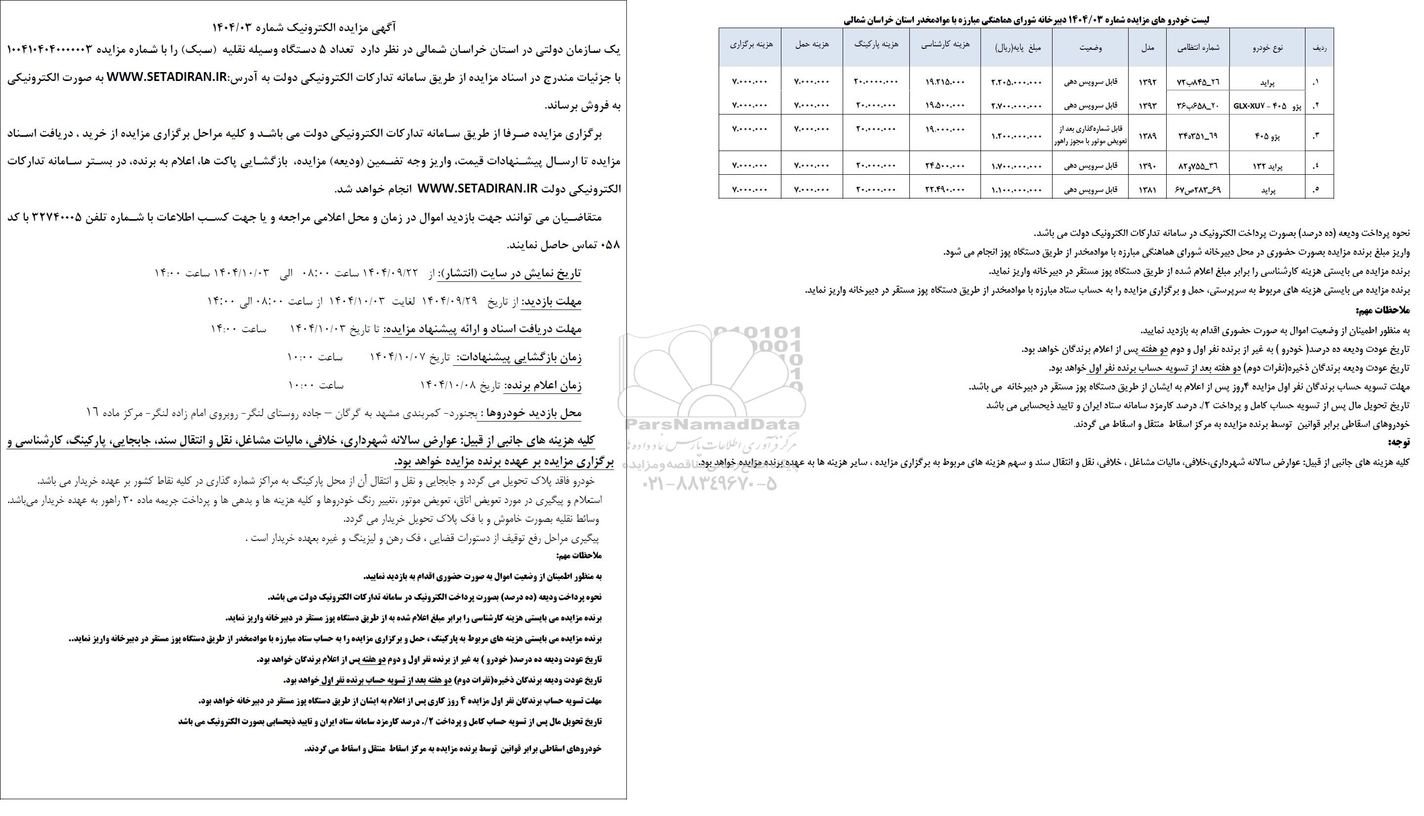 لیست خودروهای مزایده شماره 1404.03 دبیرخانه شورای هماهنگی مبارزه با مواد مخدر استان خراسان شمالی
