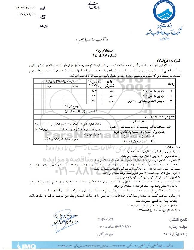 با سلام این شرکت بر اساس آئین نامه معاملات خود در نظر دارد اقلام مشروحه ذیل را از طریق استعلام بها، خریداری نماید. مقتضی است با توجه به توضیحات زیر قیمت پیشنهادی را به عدد و حروف با مهلت داده شده در قسمت مربوطه درج نمایی که به پیشنهاداتی که مشروط و مبهم و بدون مهر و امجده باشد، ترتیب اثر داده نخواهد شد.