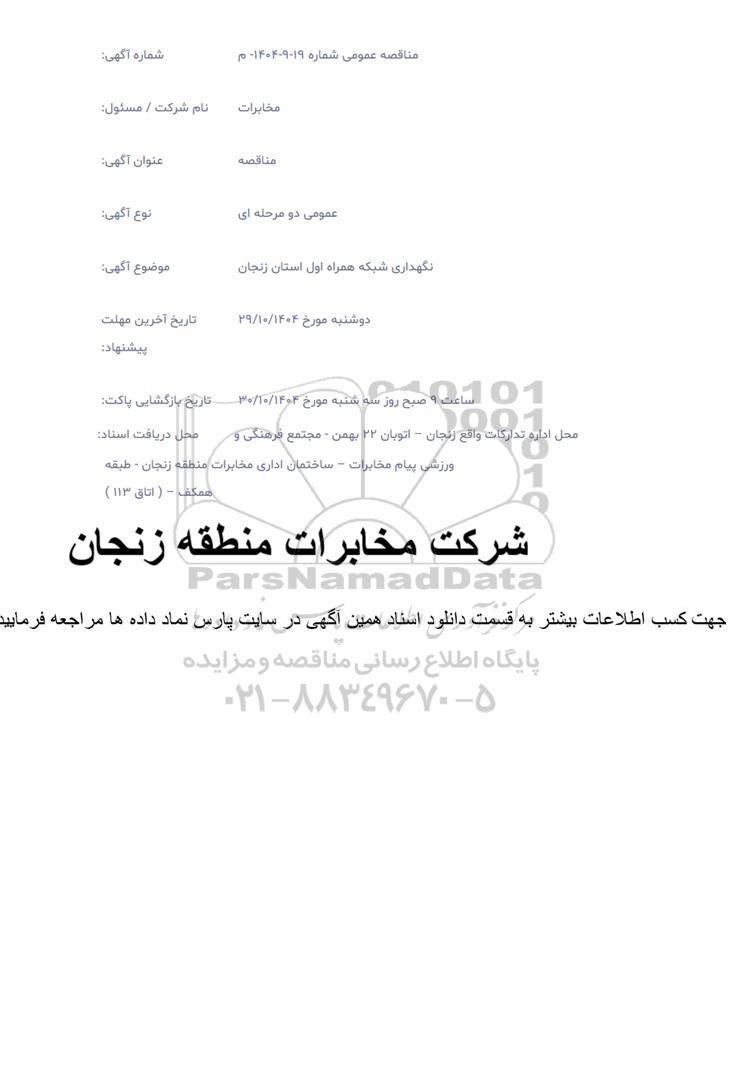 شماره آگهی: مناقصه عمومی 19-9-1404-م