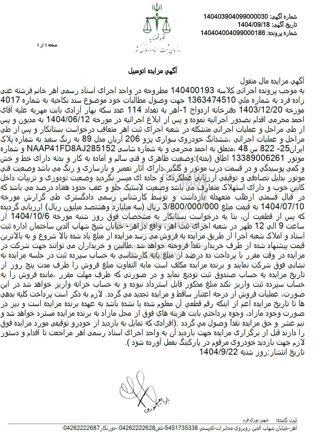 به موجب پرونده اجرائی کلاسه 140400193 مطروحه در واحد اجرای اسناد رسمی اهر خانم فرشته غنی زاده فرد به شماره ملی 1363474510 جهت وصول مطالبات خود موضوع سند نکاحیه به شماره 4017 مورخه 1403/12/20 دفترخانه ازدواج -1 اهر به تعداد 114 عدد سکه بهار آزادی بابت مهریه علیه آقای احمد محرمی اقدام بصدور اجرائیه نموده و پس از ابلاغ اجرائیه در مورخه 1404/06/12 به مدیون و پس از طی مراحل و عملیات اجرائی متشکله در شعبه اجرای ثبت اهر متعاقب درخواست بستانکار و پس از طی مراحل و عملیات اجرائی ، ششدانگ خودروی سواری پژو 206 آریان مدل 89 به رنگ سفید به شماره پلاک ایران 82225 س 48 ، متعلق به احمد محرمی و به شماره شاسی NAAP41FD8AJ285152 و شماره موتور 13389006261 اطاق (بدنه) وضعیت ظاهری و فنی سالم و آماده به کار و بدنه دارای خط و خش و کمی پوسیدگی و در قسمت درب موتور و گلگیر دارای آثار تعمیر و بازسازی و رنگ می باشد وضعیت فنی موتور بدلیل تصادفی و توقیفی ارزیابی عملکردی و جاده ای میسر نگردید وضعیت تودوزی و تزییات داخل کابین خوب و دارای استهلاک متعارف میباشد وضعیت لاستیک جلو و عقب حدود هفتاد درصد می باشد که در قبال قسمتی از طلب متعهدله بازداشت و توسط کارشناس رسمی دادگستری طی گزارش مورخه 1404.07.10 به قیمت مبلغ 3.800.000.000 ریال سه میلیارد و هشتصد میلیون ریال ارزیابی گردیده که پس از قطعیت آن بنا به درخواست بستانکار به مشخصات فوق روز شنبه مورخه 1404.10.6 از ساعت 9 الی 12 ظهر در شعبه اجرای ثبت اهر واقع در اهر - خیابان شیخ شهاب الدین ساختمان اداره ثبت اسناد و املاک شعبه اجرا از طریق مزایده به فروش میرسد مزایده از مبلغ یاد شده بالا شروع و به بالاترین قیمت پیشنهاد شده از طرف خریدار نقدا فروخته خواهد شد. طالبین و خریداران میتوانند جهت شرکت در مزایده در وقت مقرر با پرداخت ده درصد از مبلغ پایه کارشناسی به حساب سپرده ثبت در جلسه مزایده به نشانی فوق شرکت نمایند و برنده مزایده مکلف است ما به التفاوت مبلغ فروش را ظرف مدت پنج روز از تاریخ مزایده به حساب صندوق ثبت تودیع نماید و در صورتی که ظرف مهلت مقرر ، مانده فروش را به حساب سپرده ثبت واریز نکند مبلغ مذکور قابل استرداد نبوده و به حساب خزانه واریز خواهد شد در این صورت عملیات فروش از درجه اعتبار ساقط و مزایده تجدید میگردد. لازم به ذکر است پرداخت کلیه بدهی ها تا تاریخ مزایده اعم از اینکه رقم قطعی آن معلوم شده یا نشده باشد به عهده برنده مزایده است و نیز در صورت وجود مازاد وجوه پرداختی بابت هزینه های فوق از محل مازاد به برنده مزایده مسترد خواهد شد و نیم عشر و حق مزایده نقداً وصول می گردد . افرادی که تمایل به بازدید از خودرو توقیفی مورد مزایده فوق را دارند قبل از برگزاری مزایده جهت بازدید آن به واحد اجرای اسناد رسمی اهر مراجعت تا اقدام و دستور لازم جهت بازدید خودروی مرقوم در پارکینگ بعمل آورده شود ).