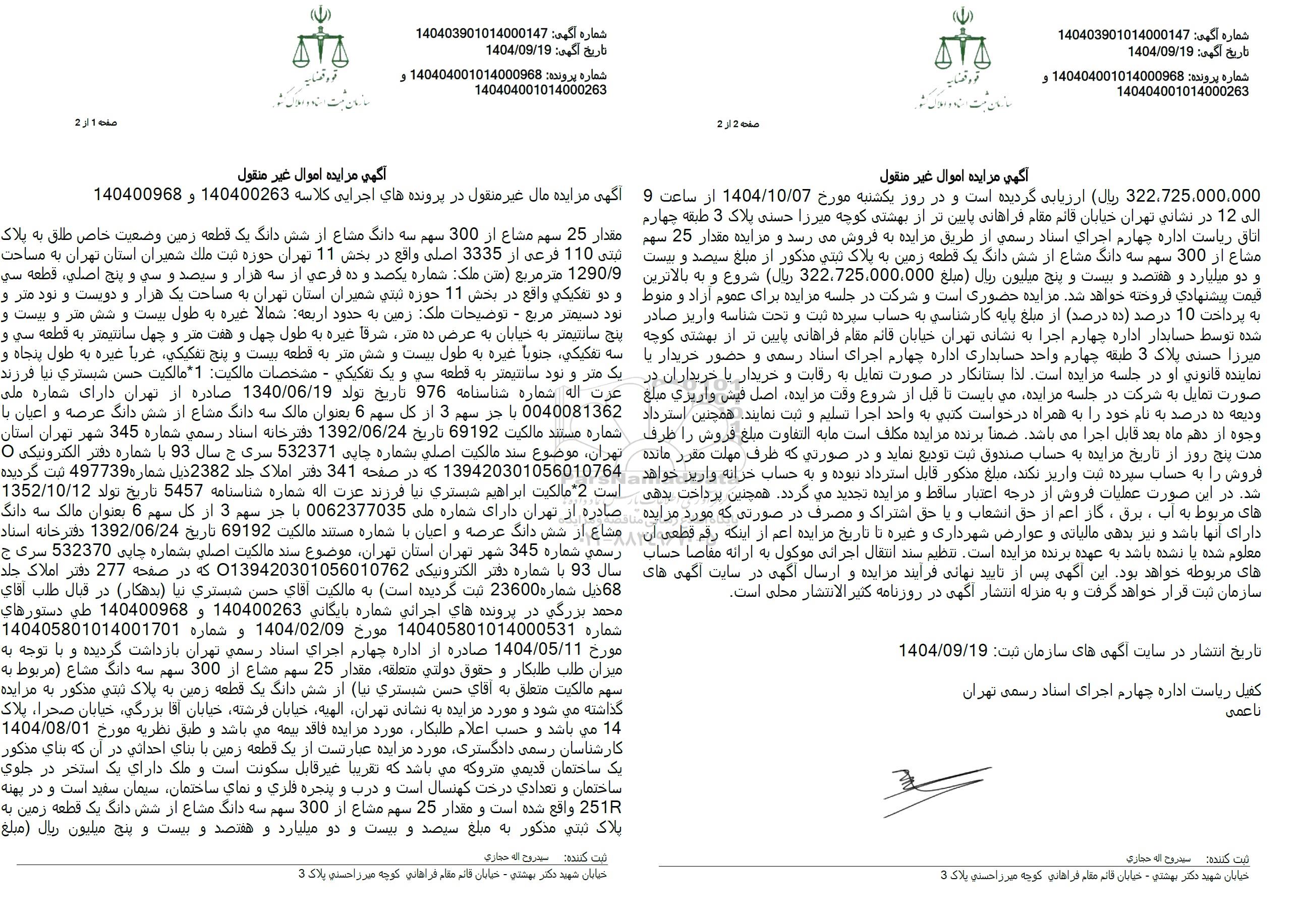 مقدار 25 سهم مشاع از 300 سهم سه دانگ مشاع از شش دانگ یک قطعه زمین وضعیت خاص طلق به پلاک تبتی 110 فرعی از 3335 اصلی واقع در بخش 11 تهران حوزه ثبت ملک شمیران استان تهران به مساحت 1290.9 متر مربع (متن ملک: شماره یکصد و ده فرعی از سه هزار و سیصد و سی و پنج اصلی، قطعه سی و دو تفکیکی واقع در بخش 11 حوزه ثبتی شمیران استان تهران به مساحت یک هزار و دویست و نود متر و بود دسیمتر مربع - توضیحات ملک زمین به حدود اربعه شمالا غیره به طول بیست و شش متر و بیست و پنج سانتیمتر به خیابان به عرض ده متر شرقا غیره به طول چهل و هفت متر و چهل سانتیمتر به قطعه سی و سه تفکیکی جنوباً غیره به طول بیست و شش متر به قطعه بیست و پنج تفكیكی غرباً غیره به طول پنجاه و یک متر و نود سانتیمتر به قطعه سی و یک تفکیکی - مشخصات مالكیت 1 مالكیت حسن شبستری نیا فرزند عزت اله شماره شناسنامه 976 تاریخ تولد 1340.06.19 صادره از تهران دارای شماره ملی 0040081362 یا جز سهم 3 از کل سهم 6 بعنوان مالک سه دانگ مشاع از شش دانگ عرصه و اعیان با شماره مستند مالكیت 69192 تاریخ 1392.06.24 دفترخانه اسناد رسمی شماره 345 شهر تهران استان تهران موضوع سند مالکیت اصلی بشماره چاپی 532371 سری ج سال 93 با شماره دفتر الکترونیکی 0 139420301056010764 که در صفحه 341 دفتر املاک جلد 2382 ذیل شماره 497739 ثبت گردیده است 2 مالكیت ابراهیم شبستری نیا فرزند عزت اله شماره شناسنامه 5457 تاریخ تولد 1352.10.12 صادره از تهران دارای شماره طی 0062377035 با جز سهم 3 از کل سهم 6 بعنوان مالک سه دانگ مشاع از شش دانگ عرصه و اعیان با شماره مستند مالکیت 69192 تاریخ 1392.06.24 دفترخانه اسناد رسمی شماره 345 شهر تهران استان تهران موضوع سند مالکیت اصلی بشماره چاپی 532370 سری ج سال 93 با شماره دفتر الکترونیکی 0139420301056010762 که در صفحه 277 دفتر املاک جلد 68 ذیل شماره 23600 ثبت گردیده است به مالکیت آقای حسن شبستری نیا بدهکار) در قبال طلب آقای محمد بزرگی در پرونده های اجرائی شماره بایگانی 140400263 و 140400968 طی دستورهای 140405801014001701 شماره 140405801014000531 مورخ 1404.02.09 و شماره مورخ 1404.05.11 صادره از اداره چهارم اجرای اسناد رسمی تهران بازداشت گردیده و با توجه به میزان طلب طلبکار و حقوق دولتی متعلقه مقدار 25 سهم مشاع از 300 سهم سه دانگ مشاع مربوط به سهم مالکیت متعلق به آقای حسن شبستری نیا از شش دانگ یک قطعه زمین به پلاک ثبتی مذکور به مزایده گذاشته می شود و مورد مزایده به نشانی تهران الهیه خیابان فرشته خیابان آقا بزرگی خیابان صحرا پلاک 14 می باشد و حسب اعلام طلبکار مورد مزایده فاقد بیمه میباشد و طبق نظریه مورخ 1404.08.01 کارشناسان رسمی دادگستری مورد مزایده عبارتست از یک قطعه زمین با بنای احداثی در آن که بنای مذکور یک ساختمان قدیمی متروکه میباشد که تقریبا غیر قابل سکونت است و ملک دارای یک استخر در جلوی ساختمان و تعدادی درخت کهنسال است و درب و پنجره فلزی و نمای ساختمان سیمان سفید است و در پهنه 251R واقع شده است و مقدار 25 سهم مشاع از 300 سهم سه دانگ مشاع از شش دانگ یک قطعه زمین به پلاک ثبتی مذکور به مبلغ سیصد و بیست و دو میلیارد و هفتصد و بیست و پنج میلیون ریال (کبلغ 322.725.000.000 ریال )