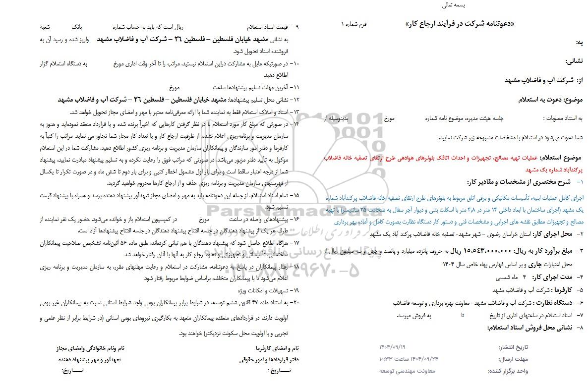 موضوع استعلام: عملیات تهیه مصالح، تجهیزات و احداث اتاقک بلوئرهای هوادهی طرح ارتقای تصفیه خانه فاضلاب پرکند آباد شماره یک مشهد