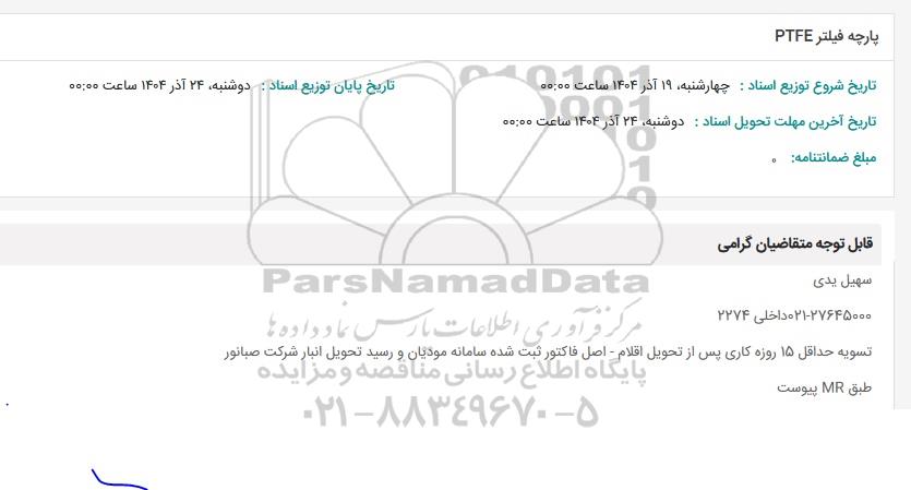 استعلام بها و موضوع استعلام استعلام پارچه فیلتر PTFE به اطلاع کلیه شرکتها و افراد متخصص واجد شرایط میرساند، آگهی گذار در نظر دارد از طریق استعلام بها، نسبت به انتخاب و دریافت پیشنهادات اقدام نماید. این استعلام با کد آگهی ثبت شده در سامانه خبرگزاری پارس نماد : 9981431 منتشر شده است. مشخصات استعلام : تاریخ شروع استعلام: 1404/09/20 آخرین مهلت ارسال پیشنهاد قیمت : 1404/09/24 و محل اجرای پروژه : استان مناقصات استان تهران میباشد. استعلام قیمت مورد درخواست : استعلام پارچه فیلتر PTFE با دستهبندیهای تخصصی و گروه های مرتبط : انواع فیلتر های تصفیه, نخ و پارچه, تجهیزات و ماشین آلات صنعتی, تجهیزات و ماشین آلات حفاری, استعلام اطلاع رسانی میگردد.