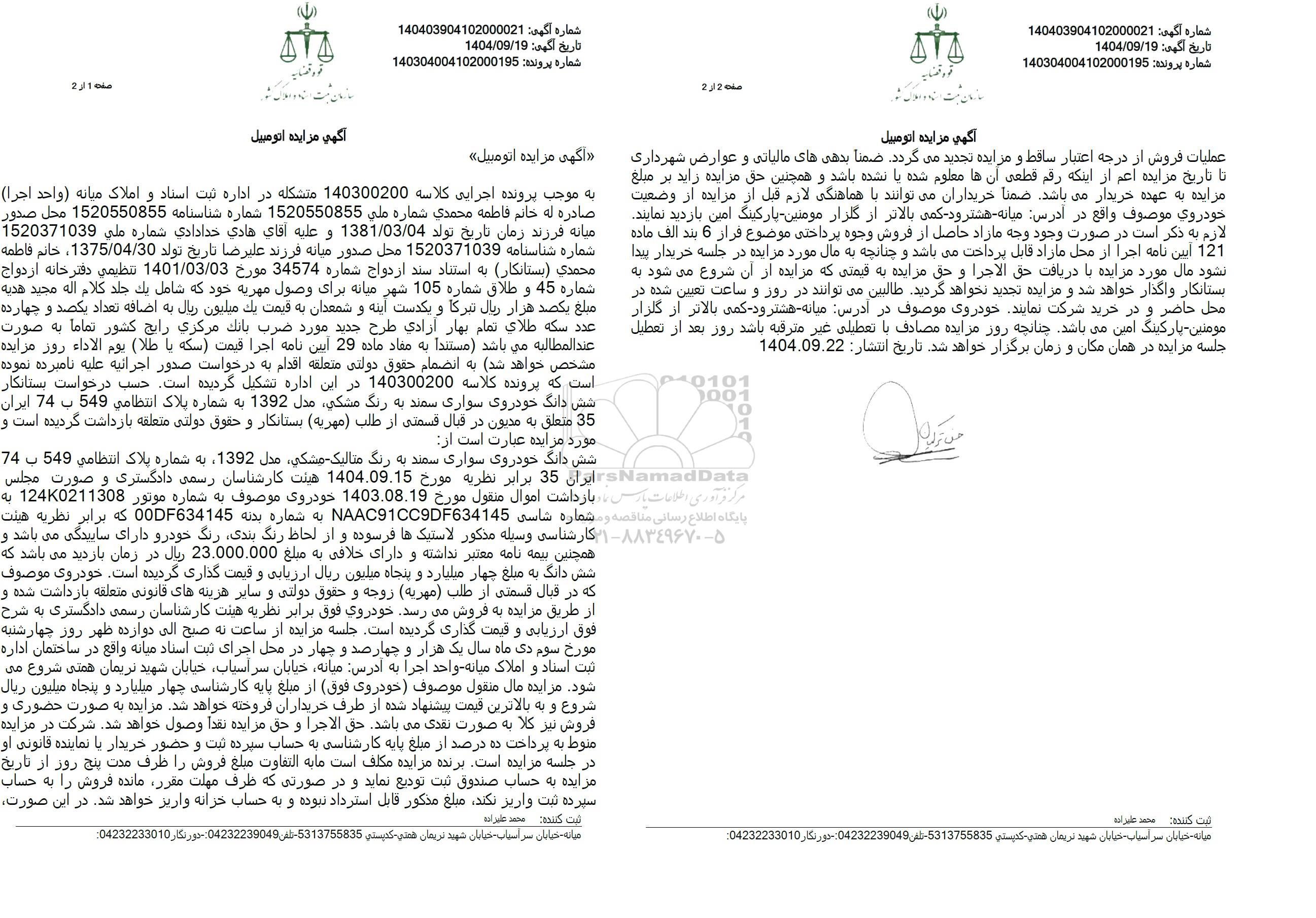 شش دانگ خودروی سواری سمند به رنگ متالیک مشکی مدل 1392 به شماره پلاک انتظامی 549 ب 74 ایران 35 برابر نظریه مورخ 1404.09.15 هیئت کارشناسان رسمی دادگستری و صورت مجلس بازداشت اموال منقول مورخ 1403.08.19 خودروی موصوف به شماره موتور 124K0211308 به شماره شاسی NAAC91CC9DF634145 به شماره بدنه OODF634145 که برابر نظریه هیئت کارشناسی وسیله مذکور لاستیک ها فرسوده و از لحاظ رنگ بندی رنگ خودرو دارای ساییدگی می باشد و همچنین بیمه نامه معتبر نداشته و دارای خلافی به مبلغ 23.000.000 ریال در زمان باردید می باشد که شش دانگ به مبلغ چهار میلیارد و پنجاه میلیون ریال ارزیابی و قیمت گذاری گردیده است. خودروی موصوف که در قبال قسمتی از طلب (مهربه) زوجه و حقوق دولتی و سایر هزینه های قانونی متعلقه بازداشت شده و از طریق مزایده به فروش میرسد. خودروی فوق برابر نظریه هیئت کارشناسان رسمی دادگستری به شرحفوق ارزیابی و قیمت گذاری گردیده است. جلسه مزایده از ساعت نه صبح الی دوازده ظهر روز چهارشنبه مورخ سوم دی ماه سال یک هزار و چهارصد و چهار در محل اجرای ثبت اسناد میانه واقع در ساختمان اداره ثبت اسناد و املاک میانه واحد اجرا به آدرس میانه خیابان سرآسیاب خیابان شهید نریمان همتی شروع می شود. مزایده مال منقول موصوف خودروی فوق از مبلغ پایه کارشناسی چهار میلیارد و پنجاه میلیون ریال شروع و به بالاترین قیمت پیشنهاد شده از طرف خریداران فروخته خواهد شد. مزایده به صورت حضوری و فروش نیز کلا به صورت نقدی می باشد. حق الاجرا و حق مزایده نقداً وصول خواهد شد. شرکت در مزایده منوط به پرداخت ده درصد از مبلغ پایه کارشناسی به حساب سپرده ثبت و حضور خریدار با نماینده قانونی او در جلسه مزایده است. برنده مزایده مکلف است ما به التفاوت مبلغ فروش را ظرف مدت پنج روز از تاریخ مزایده به حساب صندوق ثبت تودیع نماید و در صورتی که ظرف مهلت مقرر مانده فروش را به حساب سپرده ثبت واریز نکند مبلغ مذکور قابل استرداد نبوده و به حساب خزانه واریز خواهد شد. در این صورت عملیات فروش از درجه اعتبار ساقط و مزایده تجدید میگردد. ضمناً بدهی های مالیاتی و عوارض شهرداری تا تاریخ مزایده اعم از اینکه رقم قطعی آنها معلوم شده با نشده باشد و همچنین حق مزایده زاید بر مبلغ مزایده به عهده خریدار میباشد ضمنا خریداران میتوانند با هماهنگی لازم قبل از مزایده از وضعیت خودروی موصوف واقع در ادرس میانه هشترود کمی بالاتر از گلزار مومنیی پارکینگ امین بازدید نمایند. لازم به ذکر است در صورت وجود وجه مازاد حاصل از فروش وجوه پرداختی موضوع قرار 6 بند الف ماده 121 آیین نامه اجرا از محل مازاد قابل پرداخت میباشد و چنانچه به مال مورد مزایده در جلسه خریدار پیدا نشود مال مورد مزایده با دریافت حق الاجرا و حق مزایده به قیمتی که مزایده از آن شروع می شود به بستانکار واگذار خواهد شد و مزایده تجدید نخواهد گردید طالبین میتوانند در روز و ساعت تعیین شده در محل حاضر و در خرید شرکت نمایند. خودروی موصوف در آدرس میانه - هشترود کمی بالاتر از گلزار مومنین - پارکینگ امین میباشد. چنانچه روز مزایده مصادف با تعطیلی غیر مترقبه باشد روز بعد از تعطیل جلسه مزایده در همان مکان و زمان برگزار خواهد شد.