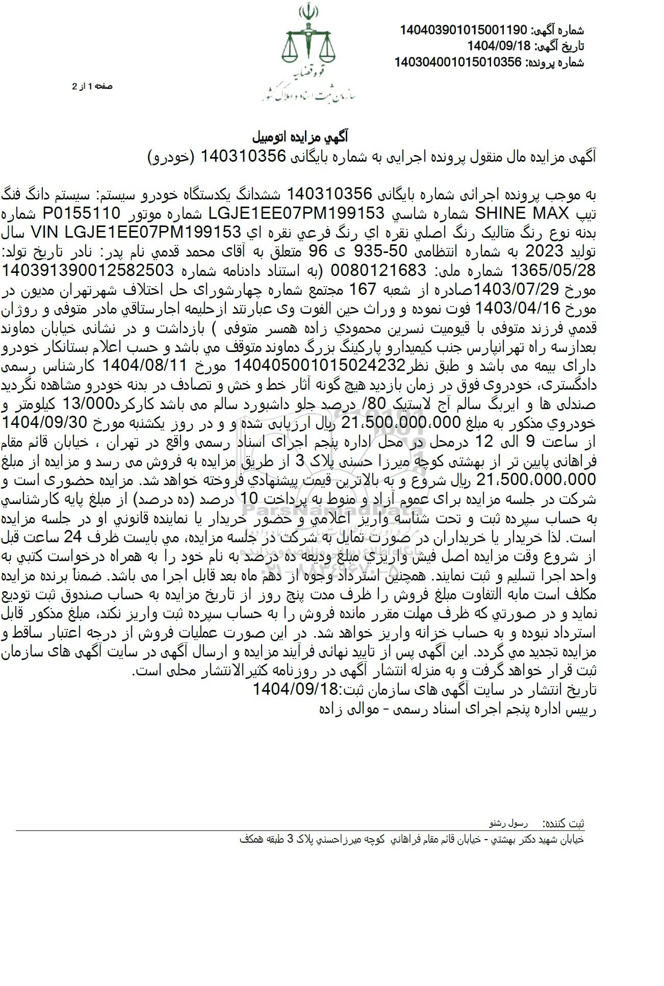 به موجب پرونده اجرائی شماره بایگانی 140310356 ششدانگ یکدستگاه خودرو سیستم سیستم دانگ فنگ شماره P0155110 شماره موتور LGJE1EE07PM199153 شماره شاسی SHINE MAX تیپ بدنه نوع رنگ متالیک رنگ اصلی نقره ای رنگ فرعی نقره ای VIN LGJE1E07199153 سال تولید 2023 به شماره انتظامی 50-935 ی 96 متعلق به آقای محمد قدمی نام پدر: نادر تاریخ تولد: 140391390012582503 1365.05.28 شماره ملی 0080121683 به استناد دادنامه شماره مورخ 1403.07.29 صادره از شعبه 167 مجتمع شماره چهار شورای حل اختلاف شهر تهران مدیون در مورخ 1403.04.16 فوت نموده و وراث حین الفوت وی عبارتند از حلیمه اجارستاقی مادر متوفی و روژان قدمی فرزند متوفی با قیومیت نسرین محمودی زاده همسر متوفی ) بازداشت و در نشانی خیابان دماوند بعد از سه راه تهرانپارس جنب کیمیدارو پارکینگ بزرگ دماوند متوقف میباشد و حسب اعلام بستانکار خودرو دارای بیمه می باشد و طبق نظر 140405001015024232 مورخ 1404.08.11 کارشناس رسمی دادگستری خودروی فوق در زمان بازدید هیچ گونه آثار خط و خش و تصادف در بدنه خودرو مشاهده نگردید صندلی ها و ایربگ سالم آج لاستیک 80 درصد جلو داشبورد سالم می باشد کارکرد 13.000 کیلومتر و خودروی مذکور به مبلغ 500،000،000، 21 ریال ارزیابی شده و و در روز یکشنبه مورخ 1404.09.30 از ساعت 9 الی 12 در محل در محل اداره پنجم اجرای اسناد رسمی واقع در تهران ، خیابان قائم مقام فراهانی پایین تر از بهشتی کوچه میرزا حسنی پلاک 3 از طریق مزایده به فروش میرسد و مزایده از مبلغ 21.500.000.000 ریال شروع و به بالاترین قیمت پیشنهادی فروخته خواهد شد. مزایده حضوری است و شرکت در جلسه مزایده برای عموم آزاد و منوط به پرداخت 10 درصد ده درصد از مبلغ پایه کارشناسی به حساب سپرده ثبت و تحت شناسه واریز اعلامی و حضور خریدار یا نماینده قانونی او در جلسه مزایده است. لذا خریدار یا خریداران در صورت تمایل به شرکت در جلسه مزایده می بایست ظرف 24 ساعت قبل از شروع وقت مزایده اصل فیش واریزی مبلغ ودیعه ده درصد به نام خود را به همراه درخواست کتبی به واحد اجرا تسلیم و ثبت نمایند. همچنین استرداد وجوه از دهم ماه بعد قابل اجرا می باشد. ضمنا برنده مزایده مکلف است مابه التفاوت مبلغ فروش را ظرف مدت پنج روز از تاریخ مزایده به حساب صندوق ثبت تودیع نماید و در صورتی که ظرف مهلت مقرر مانده فروش را به حساب سپرده ثبت واریز نکند، مبلغ مذکور قابل استرداد نبوده و به حساب خزانه واریز خواهد شد. در در این صورت عملیات فروش از درجه اعتبار ساقط و مزایده تجدید می گردد. این آگهی پس از تایید نهایی فرآیند مزایده و ارسال آگهی در سایت آگهی های سازمان ثبت قرار خواهد گرفت و به منزله انتشار آگهی در روزنامه کثیر الانتشار محلی است.