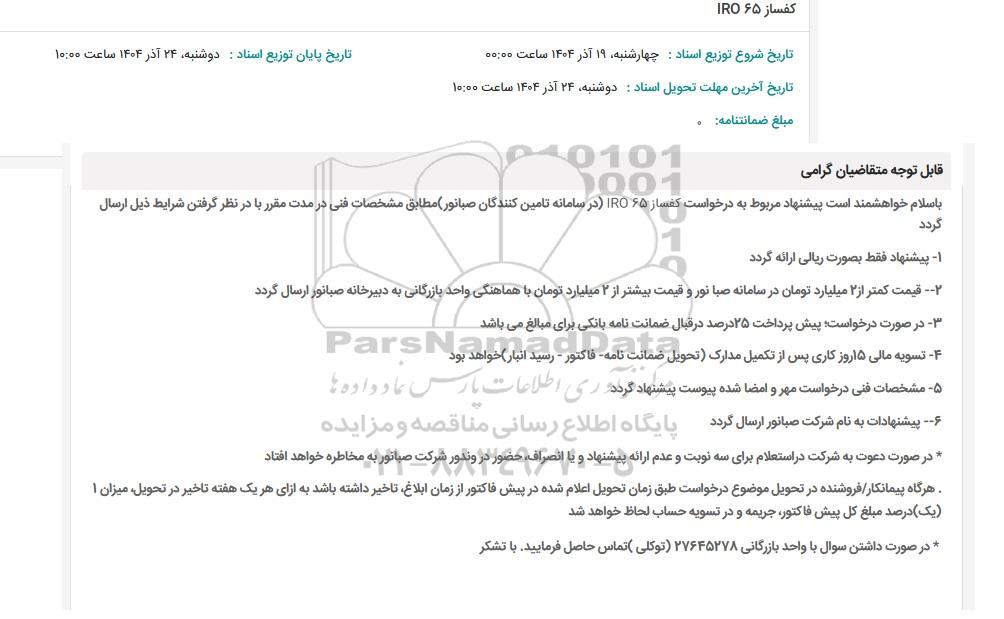با سلام خواهشمند است پیشنهاد مربوط به درخواست کفساز 65 IROدر سامانه تامین کنندگان صبانور مطابق مشخصات فنی در مدت مقرر با در نظر گرفتن شرایط ذیل ارسال گردد