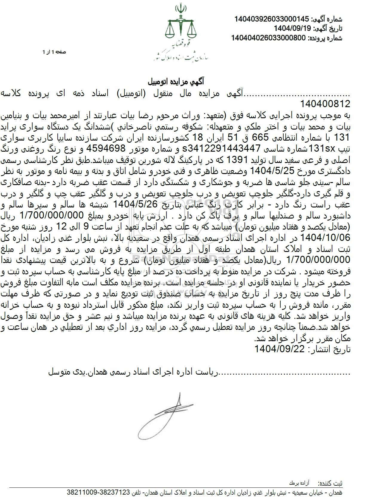 به موجب پرونده اجرایی کلاسه فوق متعهد وراث مرحوم رضا بیات عبارتند از امیر محمد بیات و بنیامین بیات و محمد بیات و اختر ملکي و متعهدله شکوفه رستمي ناصر خانی ( ششدانگ یک دستگاه سواری پراید 131 با شماره انتظامی 665 ق 51 ایران 18 کشور سازنده ایران شرکت سازنده سایپا کاربری سواری تیپ 131 شماره شاسی 3412291443447 و شماره موتور 4594698 و نوع رنگ روغنی ورنگ اصلی و فرعی سفید سال تولید 1391 که در پارکینگ لاله شورین توقیف میباشد. طبق نظر کارشناسی رسمی دادگستری مورخ 1404/5/25 وضعیت ظاهری و فنی خودرو شامل اتاق و بدنه و بیمه نامه و موتور به نظر سالم - سینی جلو شاسی ها ضربه و جوشکاری و شکستگی دارد از قسمت عقب ضربه دارد بدنه صافکاری و قلم گیری دارد گلگیر جلو چپ تعویض و درب جلو چپ تعویض و درب و گلگیر عقب چپ و گلگیر و درب عقب راست رنگ دارد - برابر کارت رنگ عباس بتاريخ 1404/5/26 شیشه ها سالم و سپرها سالم و داشبورد سالم و صندلیها سالم و برف پاک کن دارد. ارزش پایه خودرو بمبلغ 1.700.000.000 ريال معادل یکصد و هفتاد میلیون تومان میباشد که به علت عدم انجام تعهد از ساعت 9 الی 12 روز شنبه مورخ 1404.10.06 در اداره اجرای اسناد رسمی همدان واقع در سعیديه بالا، نبش بلوار غنی زادیان اداره کل ثبت اسناد و املاک استان همدان طبقه اول از طریق مزایده به فروش میرسد و مزایده از مبلغ 1.700.000.000 ریال معادل یکصد و هفتاد میلیون تومان شروع و به بالاترین قیمت پیشنهادی نقدا فروخته میشود. شرکت در مزایده منوط به پرداخت ده درصد از مبلغ پایه کارشناسی به حساب سپرده ثبت و حضور خریدار یا نماینده قانونی او در جلسه مزایده است. برنده مزایده مکلف است ما به التفاوت مبلغ فروش را ظرف مدت پنج روز از تاریخ مزایده به حساب صندوق ثبت تودیع نماید و در صورتی که ظرف مهلت مقرر مانده فروش را به حساب سپرده ثبت واریز نکند مبلغ مذکور قابل استرداد نبوده و به حساب خزانه واریز خواهد شد کلیه هزینه های قانونی به عهده برنده مزایده میباشد و نیم عشر و حق مزايده نقداً وصول خواهد شد. ضمنا چنانچه روز مزایده تعطیل رسمی گردد مزایده روز اداري بعد از تعطیلی در همان ساعت و مكان مقرر برگزار خواهد شد.
