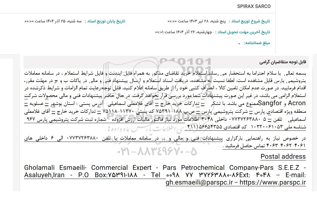 بسمه تعالی با سلام احتراما به استحضار می رساند استعلام خرید تقاضای مذکور به همراه فایل ایندنت و فایل شرایط استعلام در سامانه معاملات پتروشیمی پارس قابل مشاهده است. لطفا نسبت به مشاهده دریافت اسناد استعلام و ارسال پیشنهاد فنی و مالی در پاکات ب و ج در مهلت مقرر اقدام فرمایید. در صورت عدم امکان تامین کالا، انصراف کتبی خود را از طریق سامانه اعلام کنید. قابل توجه: رعایت تمام الزامات و شرایط ذکر شده در استعلام الزامی میباشد در غیر این صورت پیشنهادات شما مورد بررسی قرار نخواهد گرفت. در حال حاضر پیشنهادات فنی و مالی محصولات شرکت Acron و Sangfor ممنوع میباشد. با تشکر - - تدارکات خرید خارج - آقای غلامعلی اسماعیلی آدرس پستی : استان بوشهر -عسلویه - منطقه ویژه اقتصادی پارس - شرکت پتروشیمی پارس - ص.ب 188-75391 کد پستی 11370-75118 - تدارکات خرید خارج - آقای غلامعلی اسماعیلی - تلفن: 5 - 07737263880 داخلی 4048 اطلاعات مورد نیاز فاکتور مالیات ارزش افزوده - شماره ثبت شرکت پتروشیمی پارس 967 شناسه ملی 10320061053- کد اقتصادی 411156654355